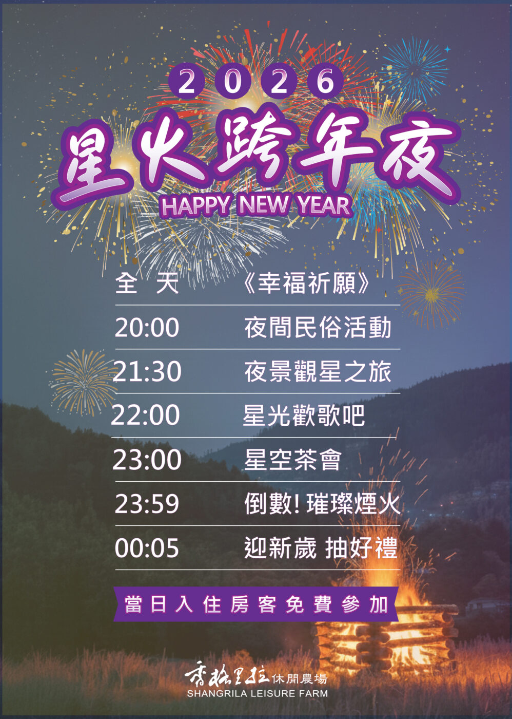 🔸活動地點:香格里拉休閒農場-茶寮 🔸活動時間:12/31(三) 🔸參與資格:當日入住房客免費參加!